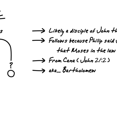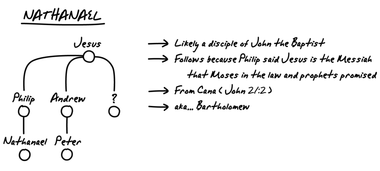 Just like Andrew, Philip can’t keep the news that he’s found the Messiah to himself. He quickly finds Nathanael, who, evidently, was also hanging out in the same area even though he’s from Cana, a city in Galilee. There isn’t anything noteworthy at the Jordan River where they all were, except that John the Baptist was baptizing there. So it seems very likely that Nathanael was a disciple of John the Baptist as well.
